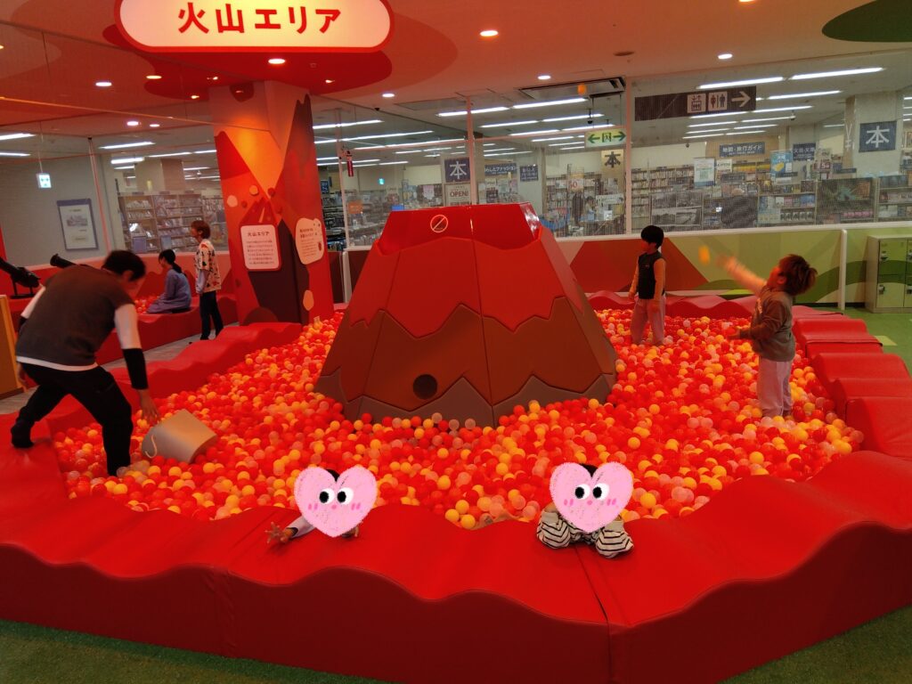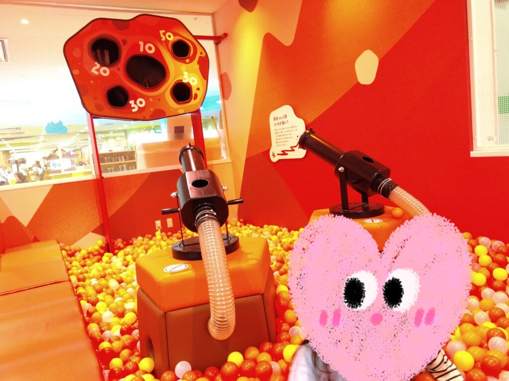 真ん中のお山にボールを投げ込むとたまに噴火してボールが返ってくる。